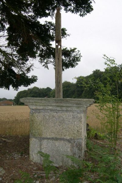 Soubassement en appareillage en pierre de taille, date gravée:1802; entablement mouluré; vestige d'une croix en bois ,ne subsiste que le fût et le montant vertical fleuronné.
