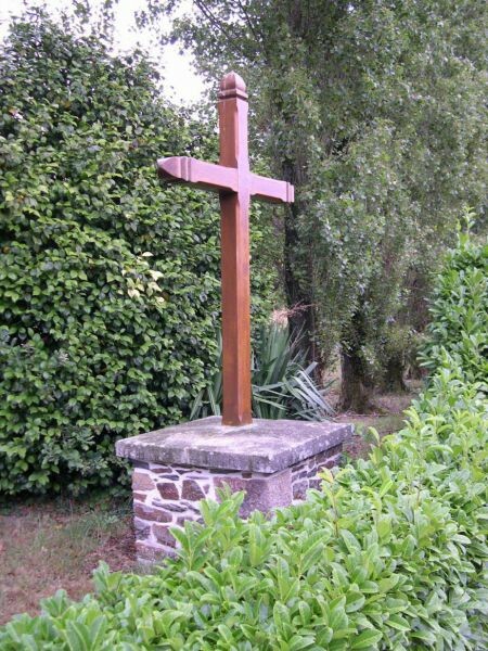 Soubassement en maçonnerie de moellons et de pierre de taille; couronnement en dalle...; croix en bois, chanfreinée, fleuronnée et peinte en marron.