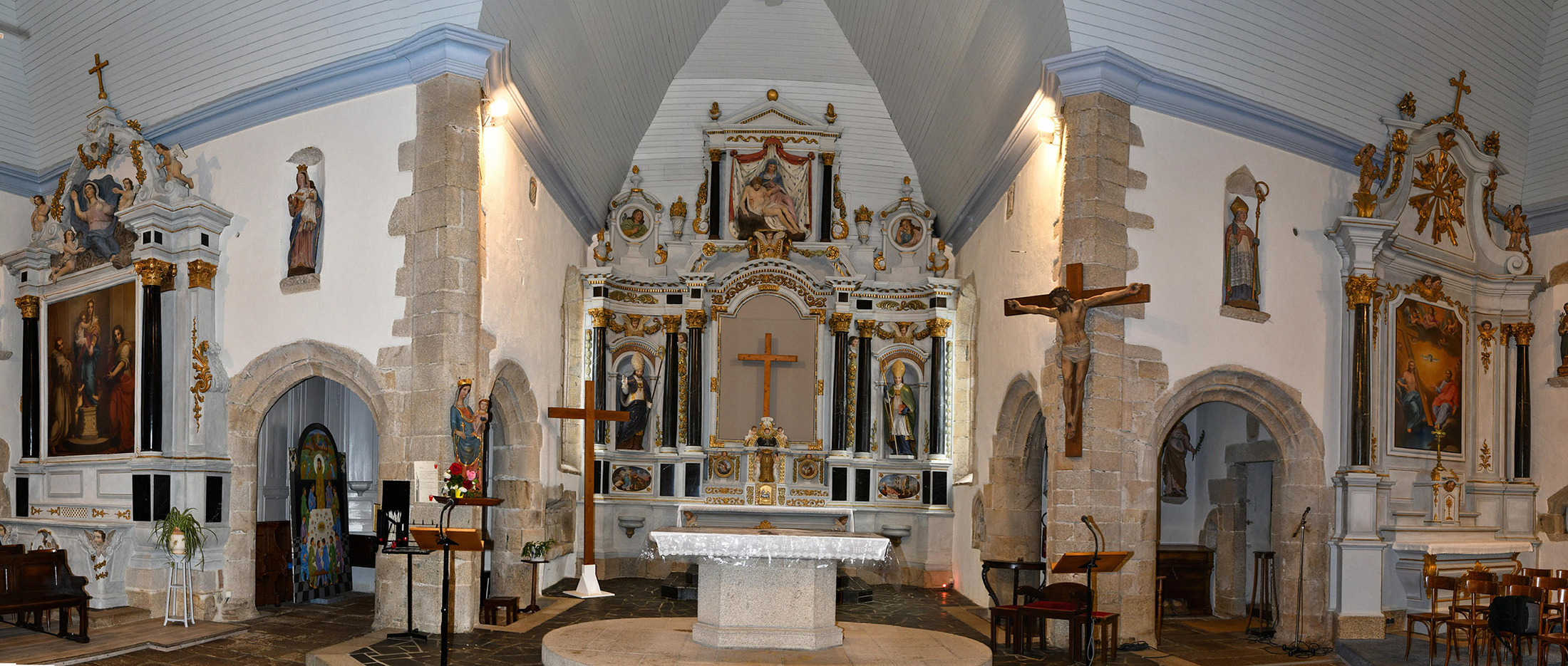 Blason des Le Sénéchal de Carcado à l'intérieur du choeur et sur le clocher.
