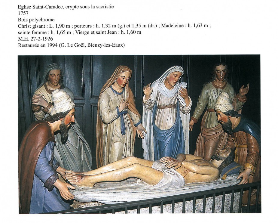L'ensemble est présenté devant des boiseries et surmonté d'un dais en menuiserie. Si les visages sont relativement peu individualisés, du moins chacun des personnages se distingue-t-il par une gestuelle propre, tout à la fois démonstrative et retenue. On retiendra en particulier le beau mouvement de la sainte femme de gauche (Marie-Madeleine ?). Bien mis en valeur par une restauration récente, le sépulcre de Saint Caradec compte parmi les vraies réussites d'une sculpture régionale, certes éloignée des canons savants prévalant en ces années centrales du XVIIIe siècle, mais capable d'exprimer une piété populaire profonde.
