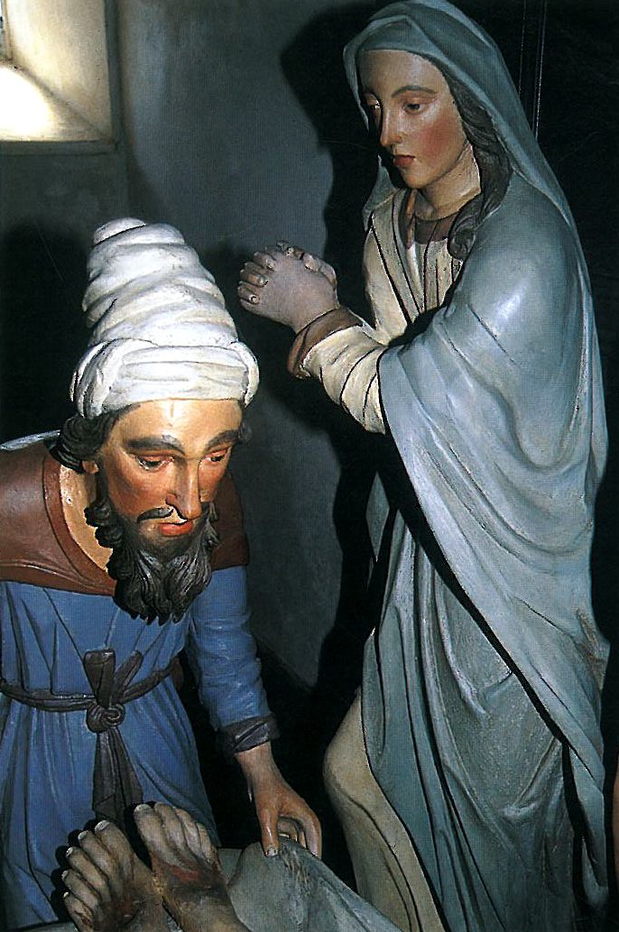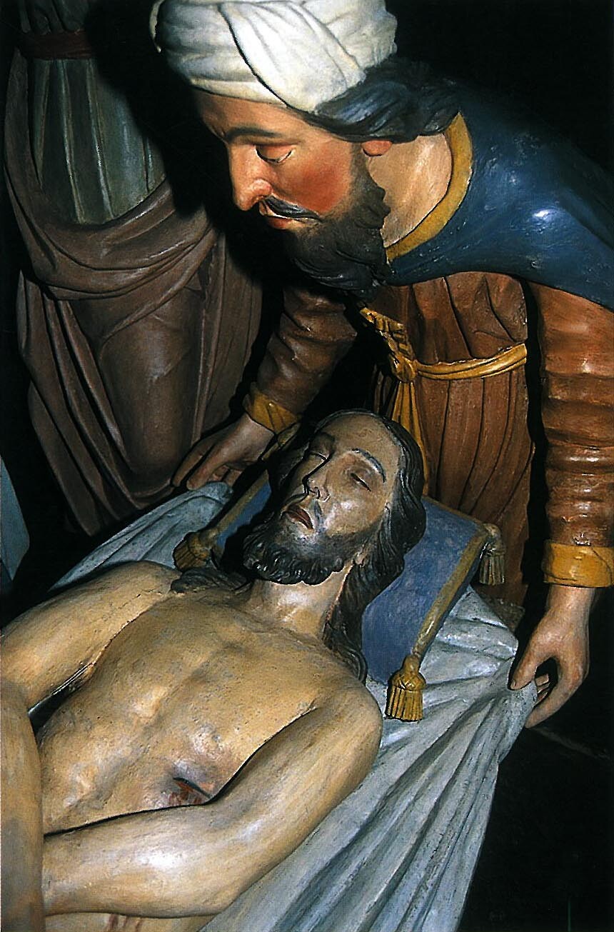 Les mains croisées du Christ disent sa totale impuissance. Les deux ensevelisseurs s'apprêtent à faire leur tâche. Ils sont comme en concertation.